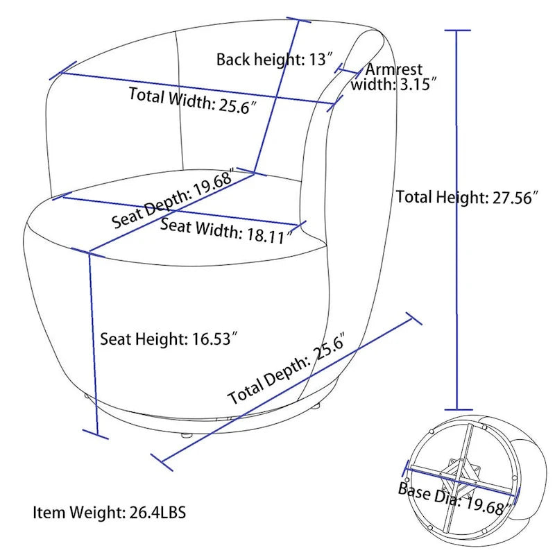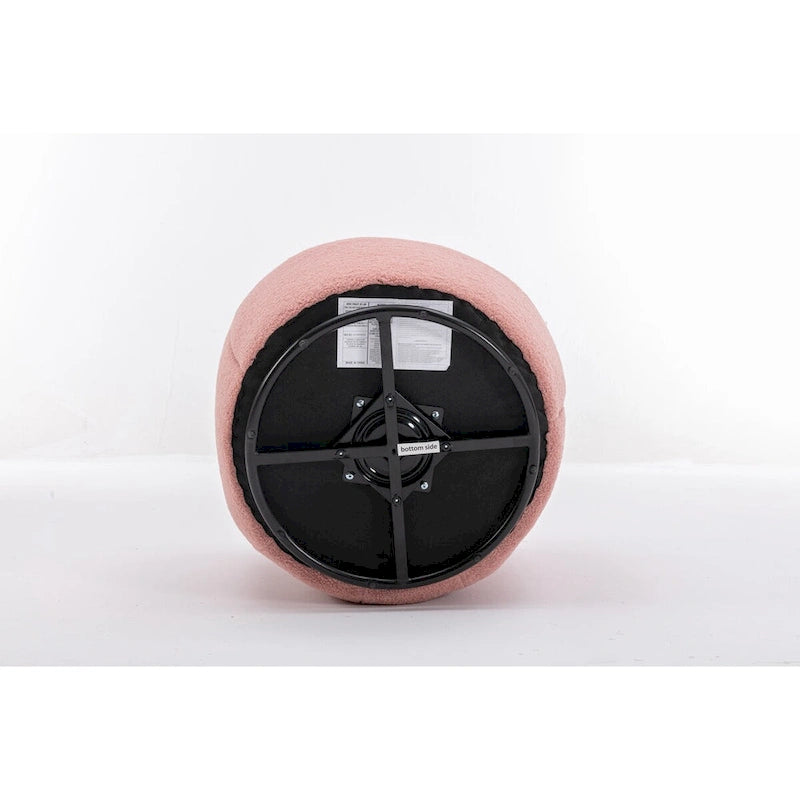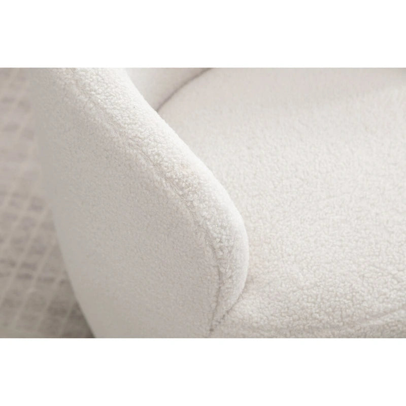 Upholstered accent chair with soft teddy fabric and foam filling. Features 360° swivel base and ergonomic backrest. Suitable for adults and children ages 5+.